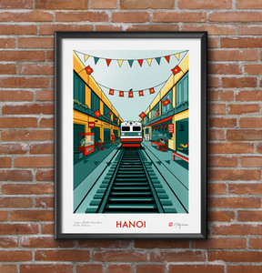 My illustration this week is inspired by the famous 'Train Street', located in the charming Old Quarter of Hanoi. This narrow backstreet boasts an array of street food stalls and quaint cafes, all neatly squeezed in on either sides of the tracks. The train that snakes its way through the alley belongs to the historical Hanoi-Hai Phong railway line, which harks back to the French colonial era. If you visit today, you'll find this stretch bustling hub with foodies and train enthusiasts alike, who flock to catch glimpses of the train, whilst trying out the local street food at the same time.